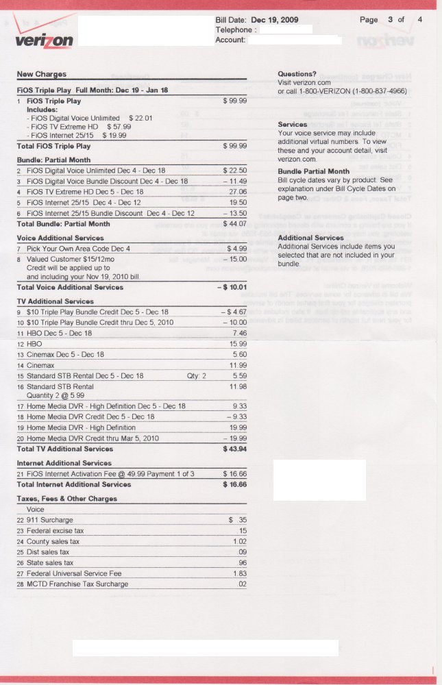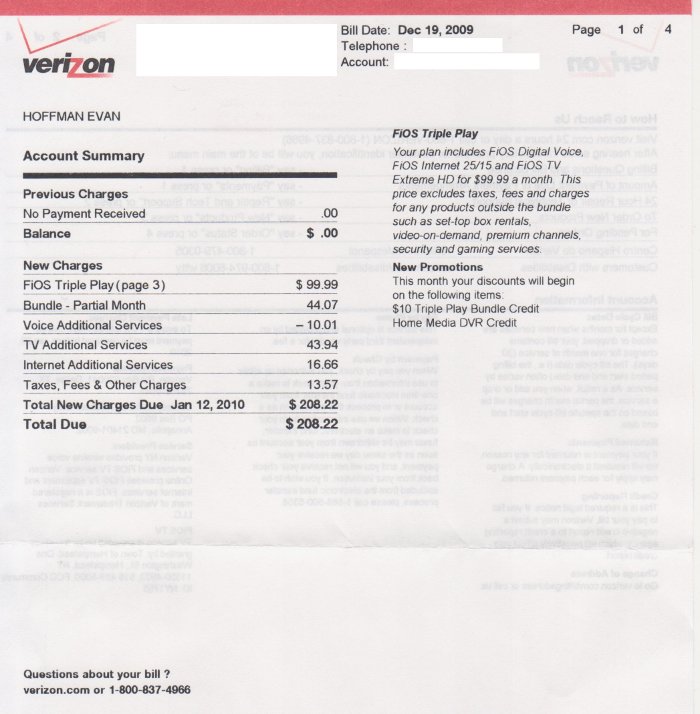 This is WAY more than it should be, even without the credits applied. There’s a $40/month credit missing, and they’re charging me for HBO & Cinemax, which I was told was a free trial for 3 months. On the plus side, the taxes are lower than I expected. Attaching scans of the bill. If this doesn’t get resolved when I call on Monday I’ll be heading back to Cablevision, I guess. The whole point of this exercise was to save money.