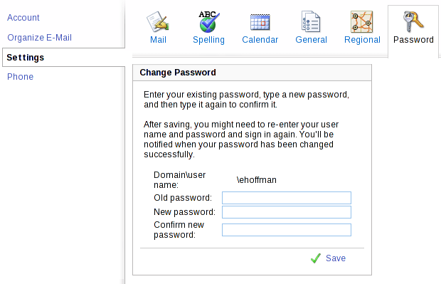 A few months ago I was on a quest to figure out how to change my Active Directory password via a browser (for Linux/Mac users). I finally figured it out, but since I’ve been working on this Exchange 2010 migration I noticed one of the features of OWA (Outlook Web App) in Exchange 2010 is that you can change the AD password right in the browser from within the app: