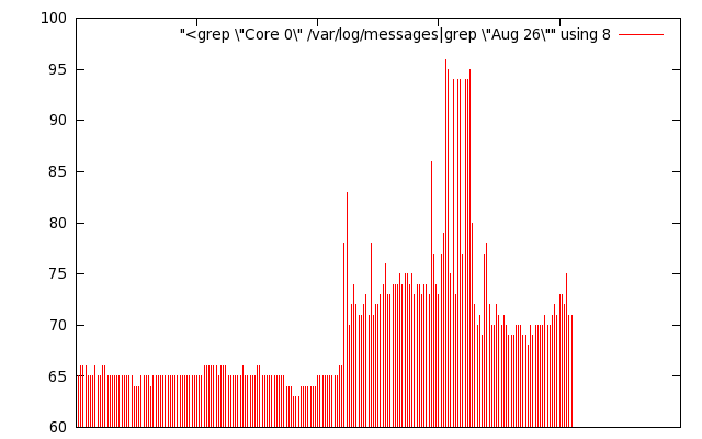 Aug 26 00:01:34 ehoffman sensord: Core 0: 65.0 C Aug 26 00:06:34 ehoffman sensord: Core 0: 65.0 C Aug 26 00:11:34 ehoffman sensord: Core 0: 66.0 C Aug 26 00:16:34 ehoffman sensord: Core 0: 66.0 C Aug 26 00:21:34 ehoffman sensord: Core 0: 66.0 C Aug 26 00:26:34 ehoffman sensord: Core 0: 65.0 C Aug 26 00:31:34 ehoffman sensord: Core 0: 65.0 C Aug 26 00:36:34 ehoffman sensord: Core 0: 65.0 C Aug 26 00:41:34 ehoffman sensord: Core 0: 66.0 C Aug 26 00:46:34 ehoffman sensord: Core 0: 65.0 C Aug 26 00:51:34 ehoffman sensord: Core 0: 65.0 C Aug 26 00:56:34 ehoffman sensord: Core 0: 66.0 C Aug 26 01:01:34 ehoffman sensord: Core 0: 66.0 C Aug 26 01:06:34 ehoffman sensord: Core 0: 65.0 C Aug 26 01:11:34 ehoffman sensord: Core 0: 65.0 C Aug 26 01:16:34 ehoffman sensord: Core 0: 65.0 C Aug 26 01:21:34 ehoffman sensord: Core 0: 65.0 C Aug 26 01:26:34 ehoffman sensord: Core 0: 65.0 C Aug 26 01:31:34 ehoffman sensord: Core 0: 65.0 C Aug 26 01:36:34 ehoffman sensord: Core 0: 65.0 C Aug 26 01:41:34 ehoffman sensord: Core 0: 65.0 C Aug 26 01:46:34 ehoffman sensord: Core 0: 65.0 C Aug 26 01:51:34 ehoffman sensord: Core 0: 65.0 C Aug 26 01:56:34 ehoffman sensord: Core 0: 65.0 C Aug 26 02:01:34 ehoffman sensord: Core 0: 64.0 C Aug 26 02:06:34 ehoffman sensord: Core 0: 64.0 C Aug 26 02:11:34 ehoffman sensord: Core 0: 64.0 C Aug 26 02:16:34 ehoffman sensord: Core 0: 65.0 C Aug 26 02:21:34 ehoffman sensord: Core 0: 65.0 C Aug 26 02:26:34 ehoffman sensord: Core 0: 65.0 C Aug 26 02:31:34 ehoffman sensord: Core 0: 65.0 C Aug 26 02:36:35 ehoffman sensord: Core 0: 64.0 C Aug 26 02:41:35 ehoffman sensord: Core 0: 65.0 C Aug 26 02:46:35 ehoffman sensord: Core 0: 65.0 C Aug 26 02:51:35 ehoffman sensord: Core 0: 65.0 C Aug 26 02:56:35 ehoffman sensord: Core 0: 65.0 C Aug 26 03:01:35 ehoffman sensord: Core 0: 65.0 C Aug 26 03:06:35 ehoffman sensord: Core 0: 65.0 C Aug 26 03:11:35 ehoffman sensord: Core 0: 65.0 C Aug 26 03:16:35 ehoffman sensord: Core 0: 65.0 C Aug 26 03:21:35 ehoffman sensord: Core 0: 65.0 C Aug 26 03:26:35 ehoffman sensord: Core 0: 65.0 C Aug 26 03:31:35 ehoffman sensord: Core 0: 65.0 C Aug 26 03:36:35 ehoffman sensord: Core 0: 65.0 C Aug 26 03:41:35 ehoffman sensord: Core 0: 65.0 C Aug 26 03:46:35 ehoffman sensord: Core 0: 65.0 C Aug 26 03:51:35 ehoffman sensord: Core 0: 65.0 C Aug 26 03:56:35 ehoffman sensord: Core 0: 65.0 C Aug 26 04:01:35 ehoffman sensord: Core 0: 65.0 C Aug 26 04:06:35 ehoffman sensord: Core 0: 65.0 C Aug 26 04:11:35 ehoffman sensord: Core 0: 65.0 C Aug 26 04:16:35 ehoffman sensord: Core 0: 65.0 C Aug 26 04:21:35 ehoffman sensord: Core 0: 65.0 C Aug 26 04:26:35 ehoffman sensord: Core 0: 66.0 C Aug 26 04:31:35 ehoffman sensord: Core 0: 66.0 C Aug 26 04:36:35 ehoffman sensord: Core 0: 66.0 C Aug 26 04:41:35 ehoffman sensord: Core 0: 66.0 C Aug 26 04:46:35 ehoffman sensord: Core 0: 66.0 C Aug 26 04:51:35 ehoffman sensord: Core 0: 66.0 C Aug 26 04:56:35 ehoffman sensord: Core 0: 65.0 C Aug 26 05:01:35 ehoffman sensord: Core 0: 66.0 C Aug 26 05:06:35 ehoffman sensord: Core 0: 66.0 C Aug 26 05:11:35 ehoffman sensord: Core 0: 66.0 C Aug 26 05:16:35 ehoffman sensord: Core 0: 65.0 C Aug 26 05:21:36 ehoffman sensord: Core 0: 65.0 C Aug 26 05:26:36 ehoffman sensord: Core 0: 65.0 C Aug 26 05:31:36 ehoffman sensord: Core 0: 65.0 C Aug 26 05:36:36 ehoffman sensord: Core 0: 65.0 C Aug 26 05:41:36 ehoffman sensord: Core 0: 65.0 C Aug 26 05:46:36 ehoffman sensord: Core 0: 66.0 C Aug 26 05:51:36 ehoffman sensord: Core 0: 65.0 C Aug 26 05:56:36 ehoffman sensord: Core 0: 65.0 C Aug 26 06:01:36 ehoffman sensord: Core 0: 65.0 C Aug 26 06:06:36 ehoffman sensord: Core 0: 65.0 C Aug 26 06:11:36 ehoffman sensord: Core 0: 65.0 C Aug 26 06:16:36 ehoffman sensord: Core 0: 66.0 C Aug 26 06:21:36 ehoffman sensord: Core 0: 66.0 C Aug 26 06:26:36 ehoffman sensord: Core 0: 65.0 C Aug 26 06:31:36 ehoffman sensord: Core 0: 65.0 C Aug 26 06:36:36 ehoffman sensord: Core 0: 65.0 C Aug 26 06:41:36 ehoffman sensord: Core 0: 65.0 C Aug 26 06:46:36 ehoffman sensord: Core 0: 65.0 C Aug 26 06:51:36 ehoffman sensord: Core 0: 65.0 C Aug 26 06:56:36 ehoffman sensord: Core 0: 65.0 C Aug 26 07:01:36 ehoffman sensord: Core 0: 65.0 C Aug 26 07:06:36 ehoffman sensord: Core 0: 65.0 C Aug 26 07:11:36 ehoffman sensord: Core 0: 65.0 C Aug 26 07:16:36 ehoffman sensord: Core 0: 64.0 C Aug 26 07:21:36 ehoffman sensord: Core 0: 64.0 C Aug 26 07:26:36 ehoffman sensord: Core 0: 64.0 C Aug 26 07:31:36 ehoffman sensord: Core 0: 63.0 C Aug 26 07:36:36 ehoffman sensord: Core 0: 63.0 C Aug 26 07:41:36 ehoffman sensord: Core 0: 63.0 C Aug 26 07:46:36 ehoffman sensord: Core 0: 64.0 C Aug 26 07:51:36 ehoffman sensord: Core 0: 64.0 C Aug 26 07:56:36 ehoffman sensord: Core 0: 64.0 C Aug 26 08:01:36 ehoffman sensord: Core 0: 64.0 C Aug 26 08:06:37 ehoffman sensord: Core 0: 64.0 C Aug 26 08:11:37 ehoffman sensord: Core 0: 64.0 C Aug 26 08:16:37 ehoffman sensord: Core 0: 64.0 C Aug 26 08:21:37 ehoffman sensord: Core 0: 65.0 C Aug 26 08:26:37 ehoffman sensord: Core 0: 65.0 C Aug 26 08:31:37 ehoffman sensord: Core 0: 65.0 C Aug 26 08:36:37 ehoffman sensord: Core 0: 65.0 C Aug 26 08:41:37 ehoffman sensord: Core 0: 65.0 C Aug 26 08:46:37 ehoffman sensord: Core 0: 65.0 C Aug 26 08:51:37 ehoffman sensord: Core 0: 65.0 C Aug 26 08:56:37 ehoffman sensord: Core 0: 65.0 C Aug 26 09:01:37 ehoffman sensord: Core 0: 65.0 C Aug 26 09:06:37 ehoffman sensord: Core 0: 66.0 C Aug 26 09:11:37 ehoffman sensord: Core 0: 66.0 C Aug 26 09:16:37 ehoffman sensord: Core 0: 78.0 C Aug 26 09:21:37 ehoffman sensord: Core 0: 83.0 C Aug 26 09:26:37 ehoffman sensord: Core 0: 70.0 C Aug 26 09:31:37 ehoffman sensord: Core 0: 72.0 C Aug 26 09:36:37 ehoffman sensord: Core 0: 74.0 C Aug 26 09:41:37 ehoffman sensord: Core 0: 72.0 C Aug 26 09:46:38 ehoffman sensord: Core 0: 71.0 C Aug 26 09:51:38 ehoffman sensord: Core 0: 71.0 C Aug 26 09:56:38 ehoffman sensord: Core 0: 72.0 C Aug 26 10:01:38 ehoffman sensord: Core 0: 73.0 C Aug 26 10:06:38 ehoffman sensord: Core 0: 71.0 C Aug 26 10:11:38 ehoffm