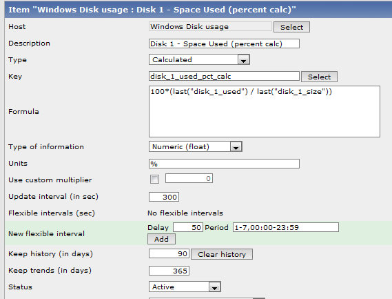 In Zabbix, I check hrStorageUsed every 15 minutes as “disk_1_used”. I check hrStorageSize every 2 hours (since the actual size of the disk/partition isn’t likely to change that often) as “disk_1_size”. To calculate the percentage, I created a “Calculated” item with this formula: