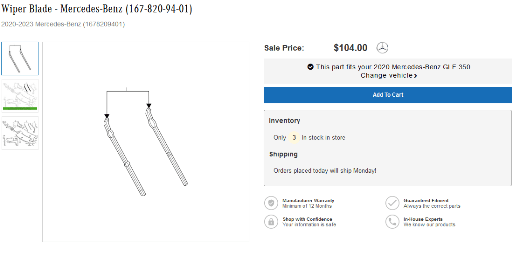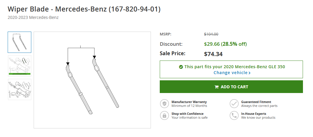 So I have a 2020 Mercedes GLE350 and I want to replace the wiper blades. My whole life I’ve just gone to AutoZone or Advance or Walmart or whatever and just gotten some Bosch or Rain-X blades or whatever but I’ve never owned a fancy car like this. Apparently Mercedes blades are special. So I find the item number on the Mercedes OEM parts site: 167-820-94-01. Now, I can’t tell if this is one blade or two: