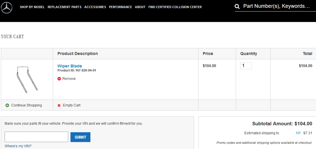 But holy FUCK, $104 for wipers? Well, let’s see if I can get them anywhere else for cheaper… Oh, here they are at oemvehicleparts.com for $74.34: