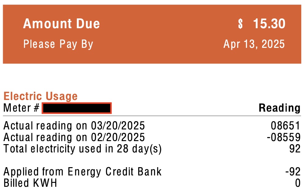 The actual usage was 92 kWh but since I had some banked it netted to zero. This is nice considering I do have an electric vehicle, so I am essentially driving it “for free” now, and I drive it a fair amount – currently averaging around 8700 miles/year on the Tesla Model Y Long Range.